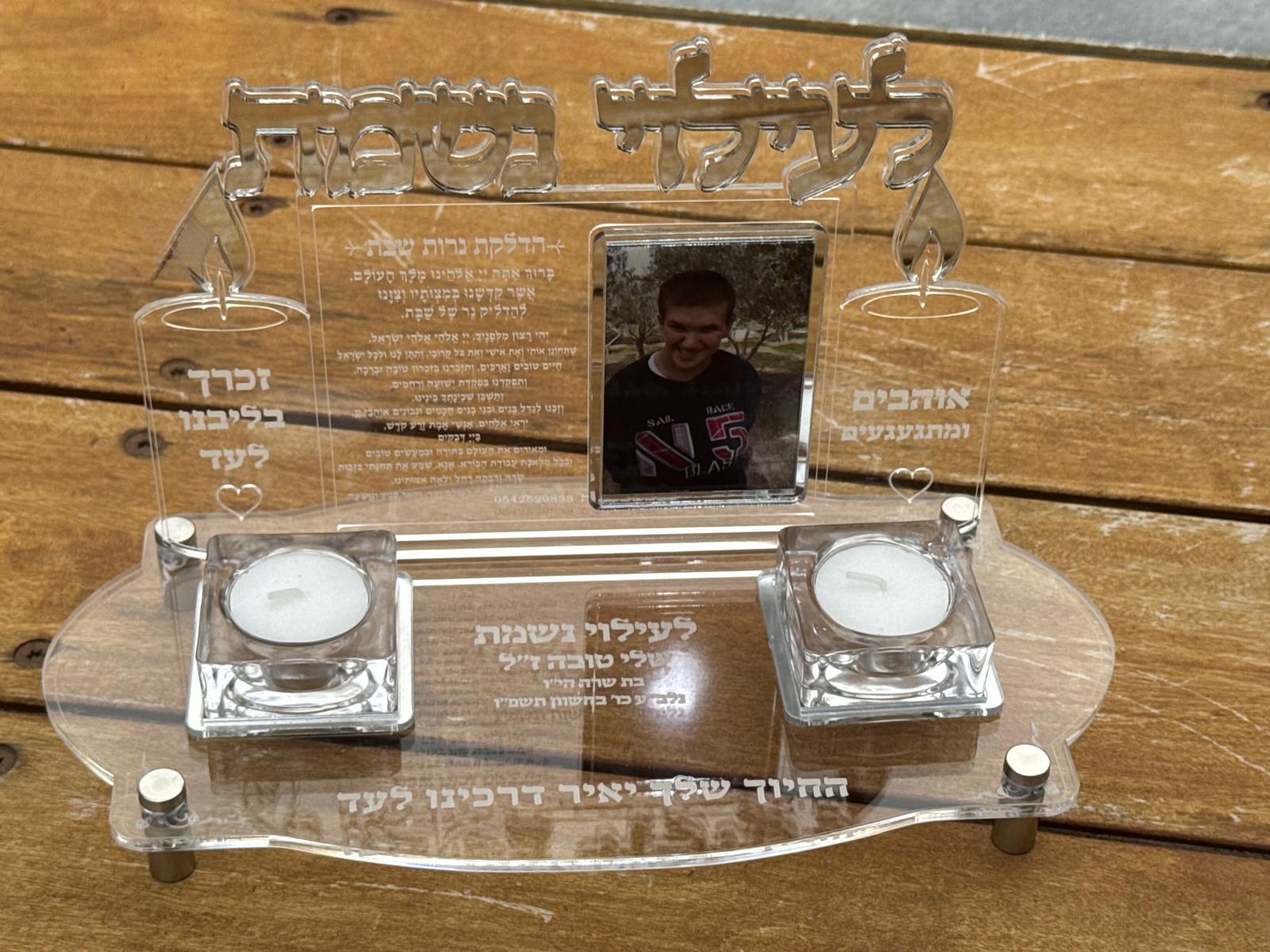 מעמד נרות שבת לעילוי נשמת המעמד מגיע עם חריטה של ברכת הדלקת נרות שבת בגב המעמד ותמונה. הקדשה בהתאמה אישית. 2 פמוטי זכוכית עם נרות. 4 רגליים להרחקה מהשיש. ניתן להוסיף כוס/ות לנר נשמה עם הקדשה/תמונה בתוספת תשלום ניתן להוסיף פמוטי זכוכית לנרות שבת בתוספת תשלום ניתן עד 12 נרות במעמד.