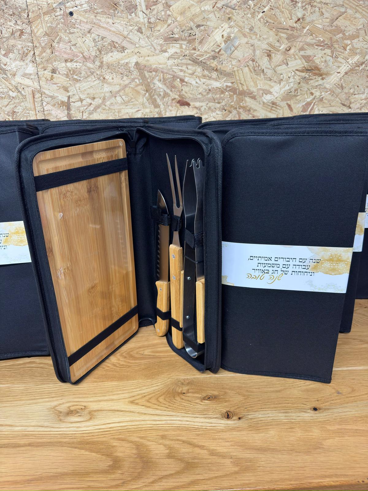 ערכת כלים מקצועית לברבקיו הכולל 4 חלקים עשויים פלדת אל חלד בשילוב עץ במבו בתוספת משטח בוצ'ר עשוי במבו 36X1.7X17 ס"מ בתיק נשיאה רב פעמי ושימושי במיוחד מגיע עם חובק ממותג, או הקדשה קצרה על התיק ניתן הדפסת ישירה על התיק בכמות מעל 20 יח' גודל התיק 19X5X39 ס"מ