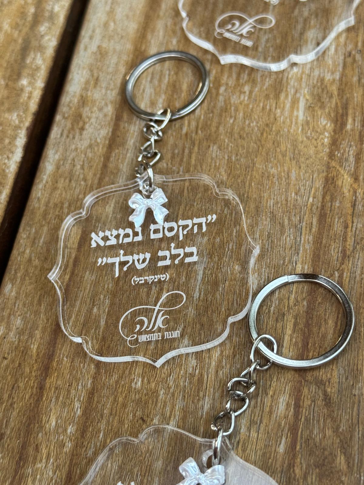 מחזיק מפתחות שקוף בחיתוך וחריטה בלייזר עשוי פרספקס שקוף חריטה וצורה בהתאמה אישית מגיע עם פפיון קטן