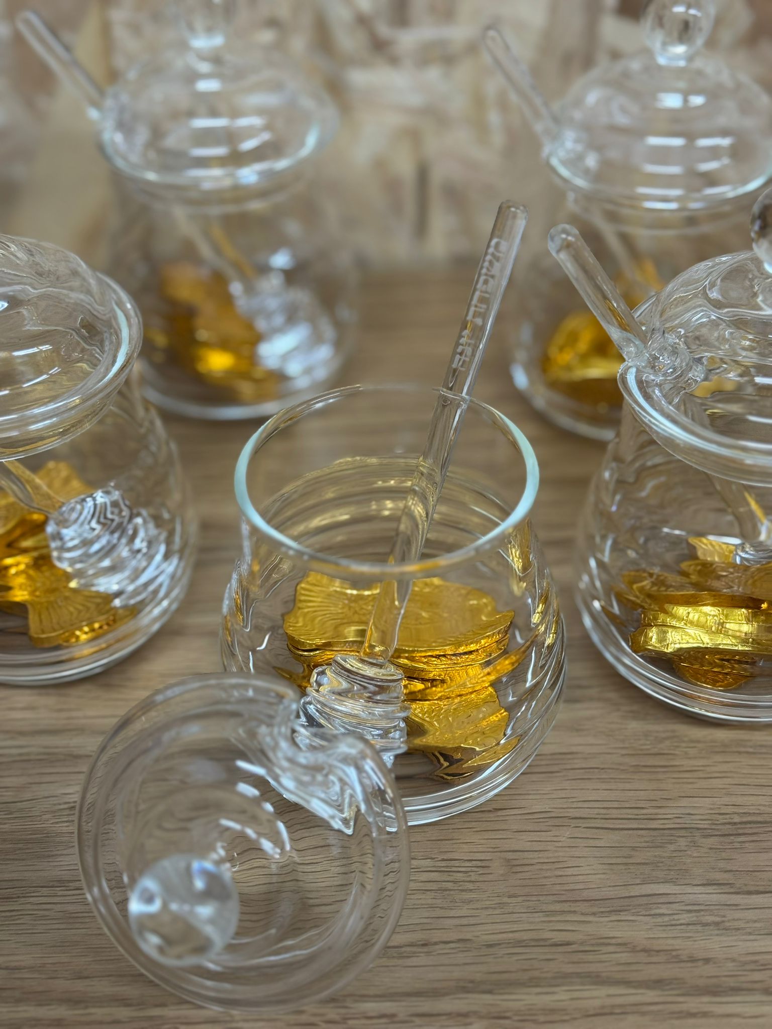 כלי דבש מעוצב עשוי זכוכית בניפוח עם מקלון עשוי זכוכית 250 מ"ל גובה: 12.7 ס"מ קוטר: 7 ס"מ| ניתן לחרוט שם משפחה על המקל מגיע ללא תכולה
