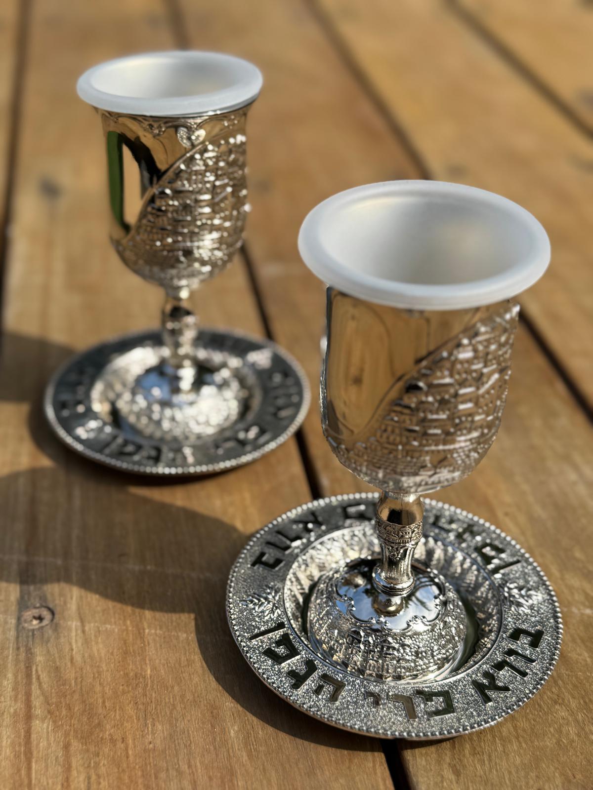 כוס קידוש עם חריטה על הצלחת מגיעה עם כוס כפולה להגנה מרבית את הגביע והצלחת אין להכניס למדיח