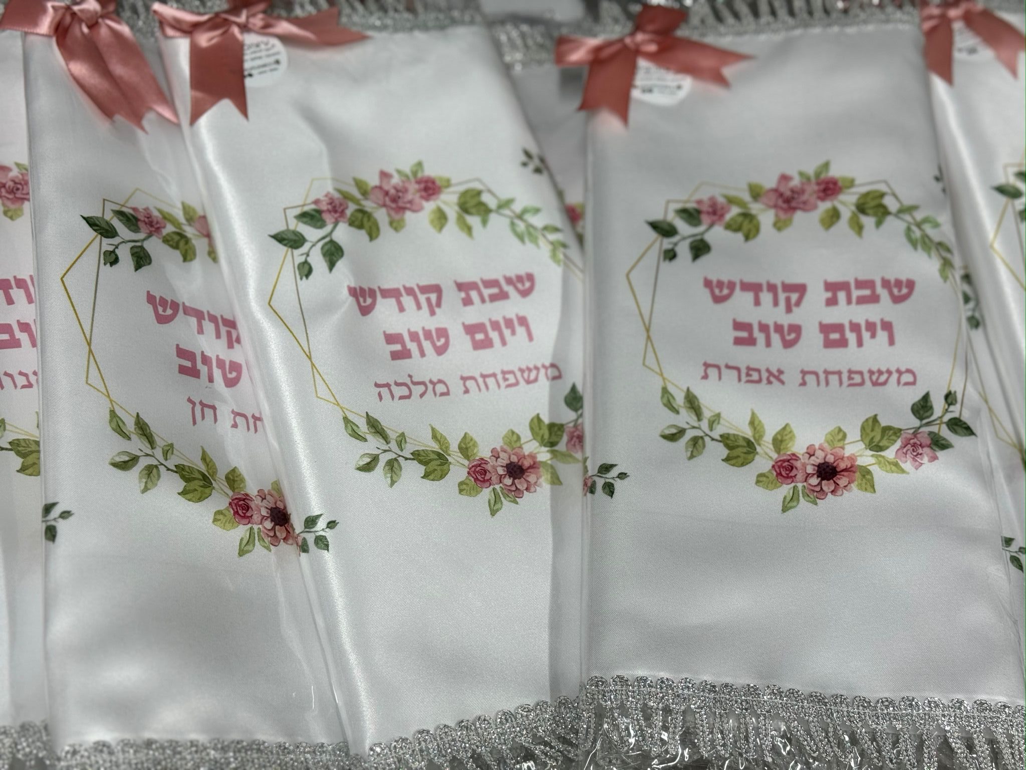 כיסוי חלות/ מצות כיסוי חלה מסאטן, גודל הכיסוי 50*40 ס"מ, מגיע עם פרנזים כסף/זהב בצדדים. במגוון עיצובים וכיתוב בהתאמה אישית