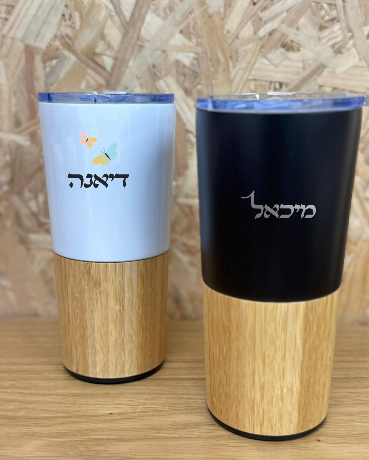כוס נירוסטה מעוצבת בשילוב במבוק שומרת חום/קור עם דופן כפולה לבידוד הנוזל תחתית מיוחדת למניעת החלקה על הכוסות בצבע לבן ניתן לבחור הדפסה צבעונית כוסות בשחור חריטה באישור מכון התקנים 600 מ"ל