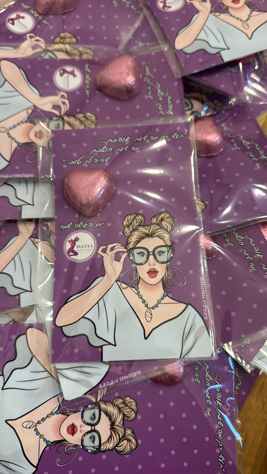 גלויה מעוצבת עם שלישיית שוקולדים כיתוב ועיצוב בהתאמה אישית ניתן להוסיף לוגו חברה. הגלויה מגיעה עטופה בצלופן. *כשרות בד"צ *השוקולד פרווה * מינימום 20 יחידות לרכישה צרו קשר לאחר רכישה לסגירת עיצוב וכו'