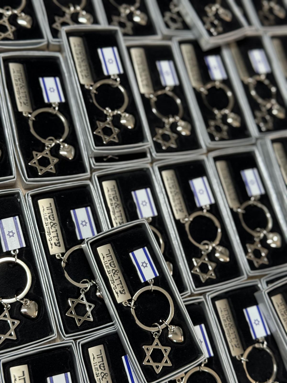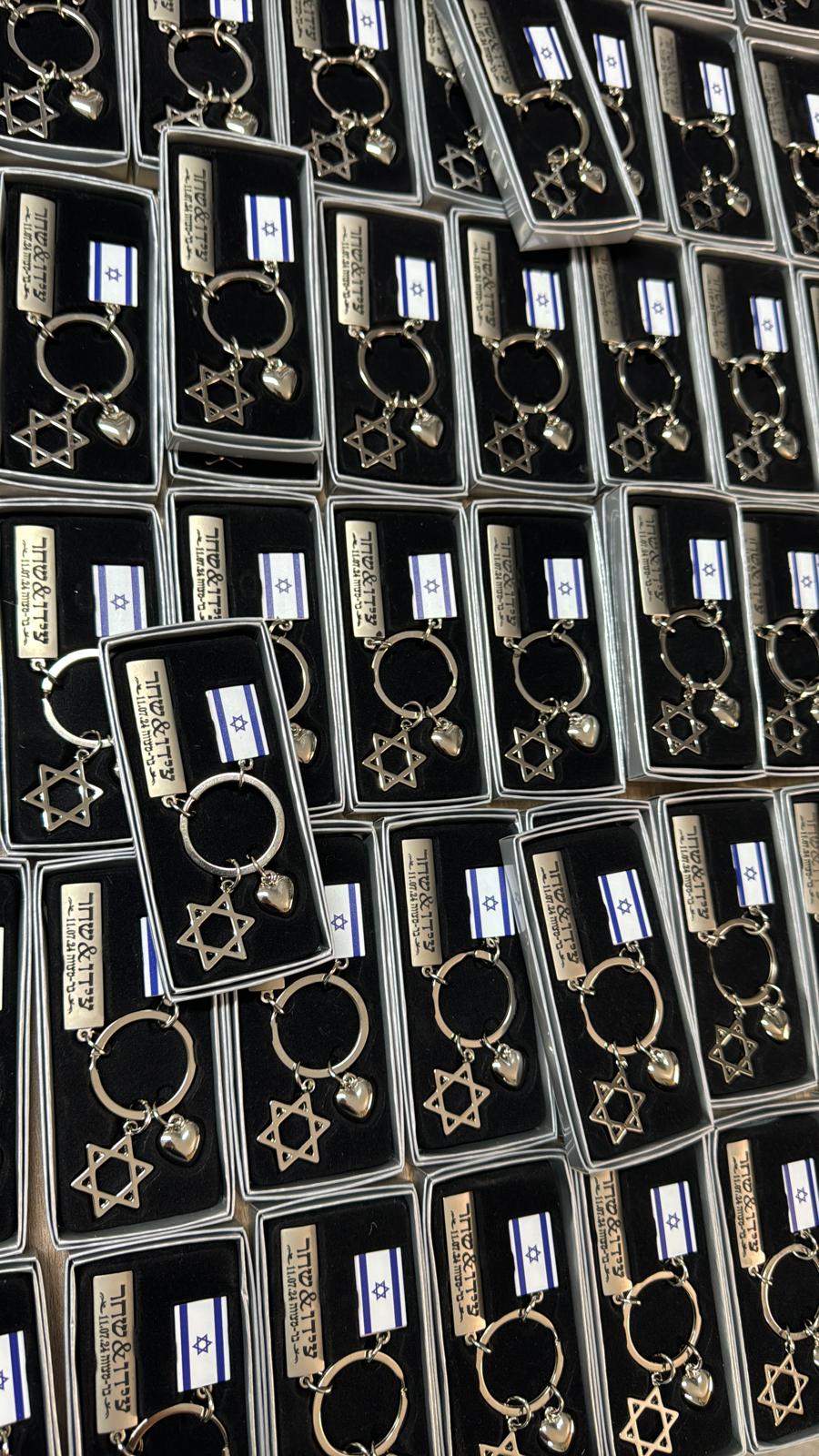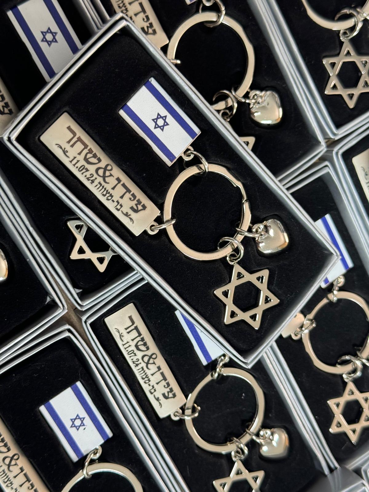 מחזיק מפתחות עשוי מתכת עם שלושה תליונים וחריטה אישית