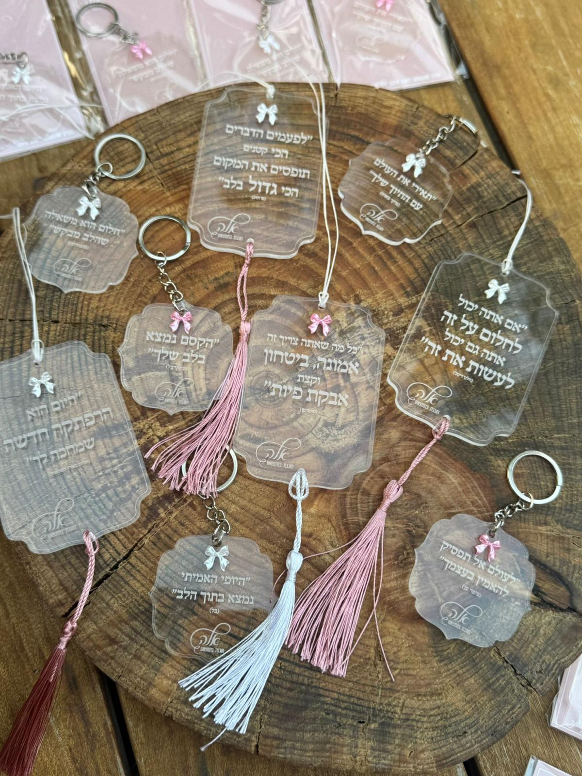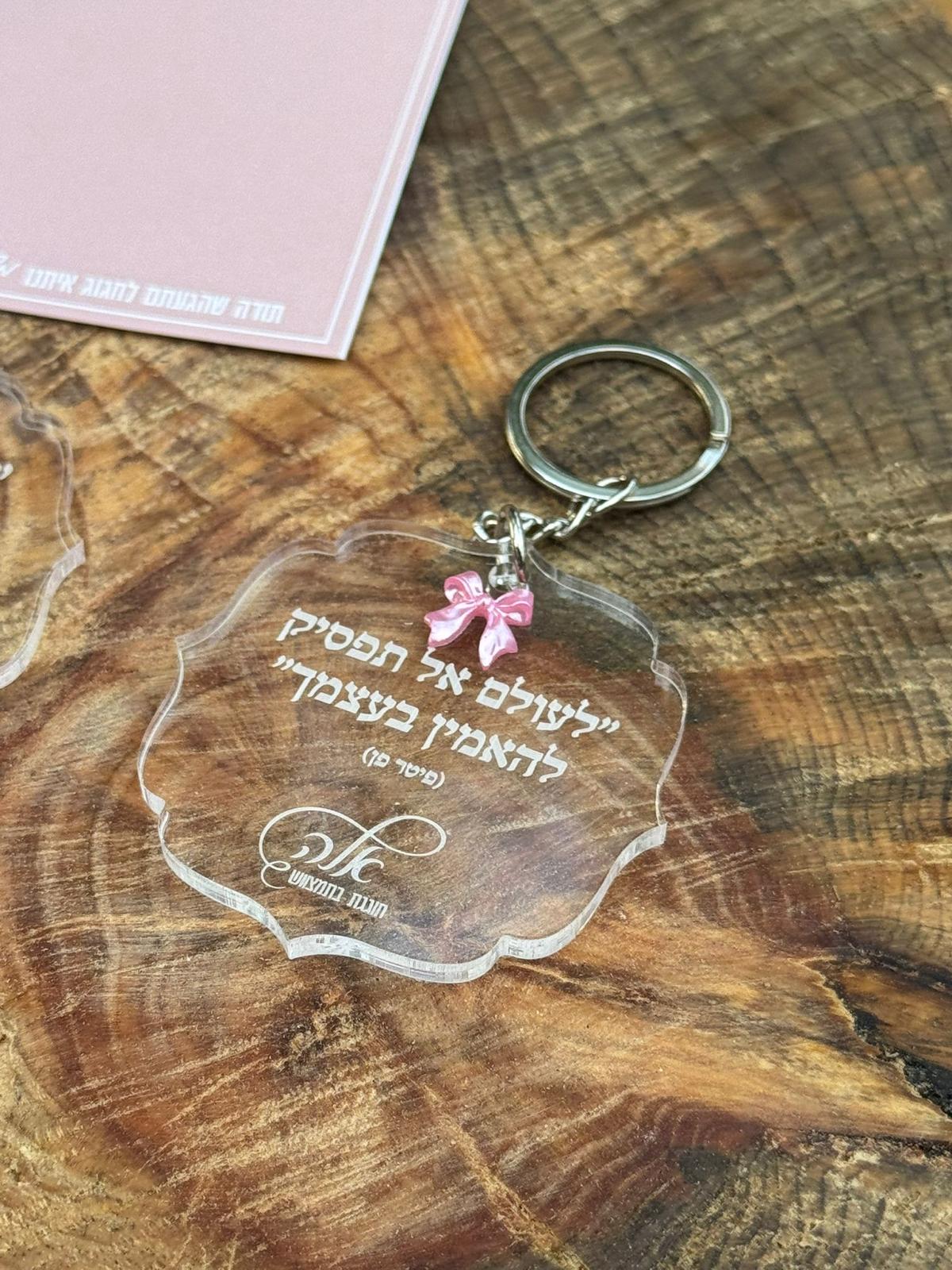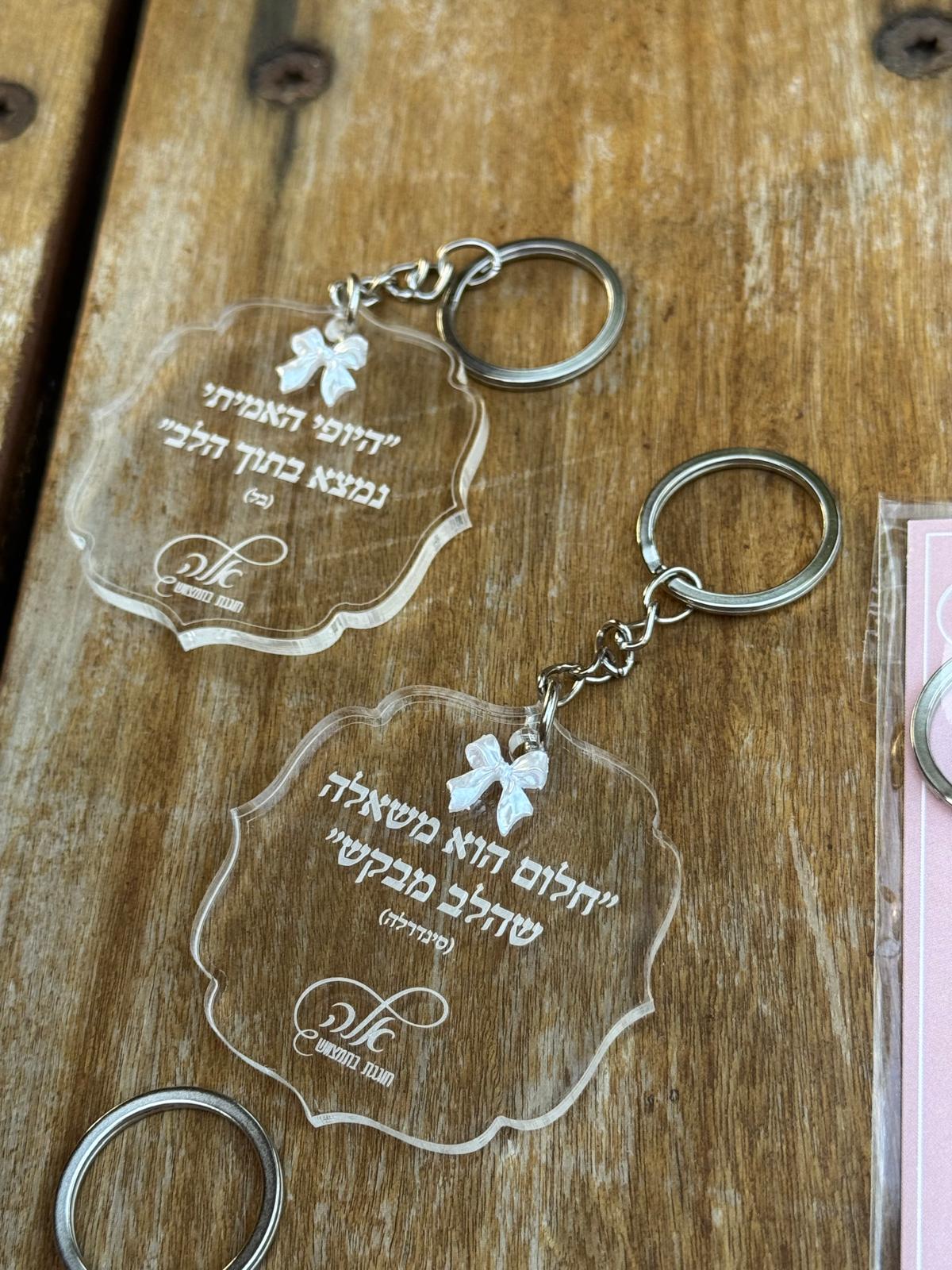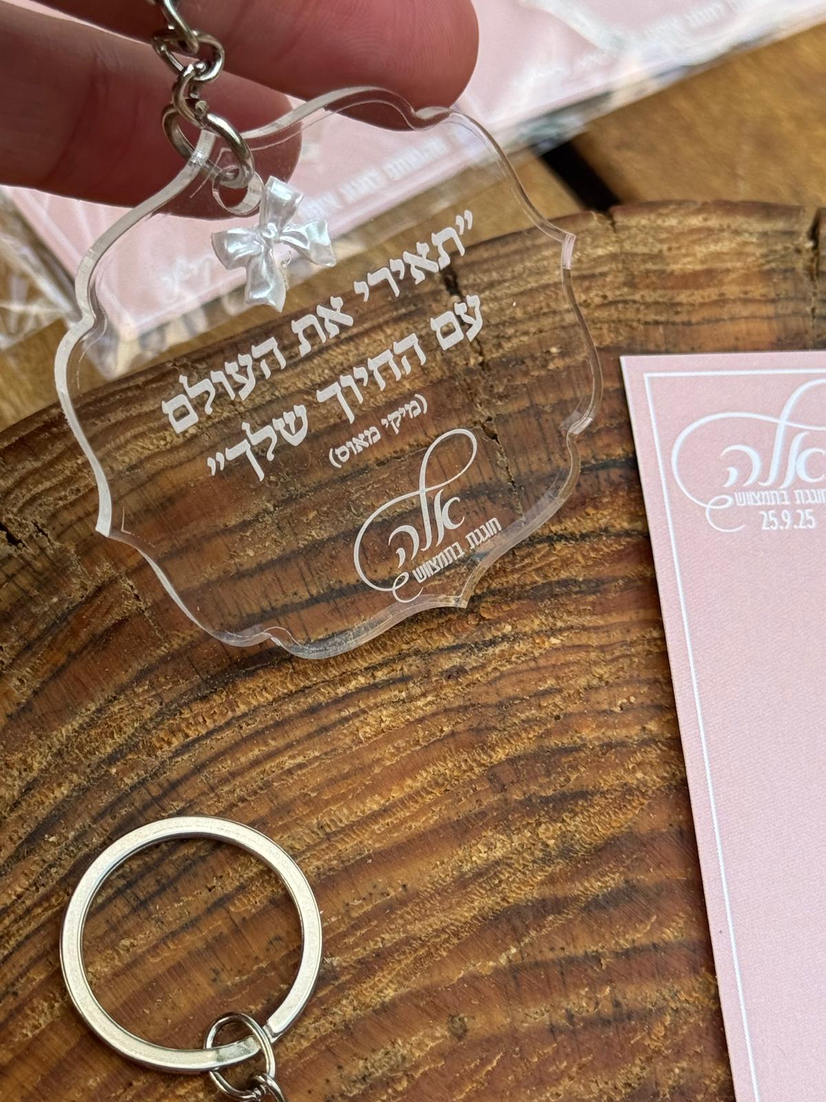 מחזיק מפתחות שקוף בחיתוך וחריטה בלייזר עשוי פרספקס שקוף חריטה וצורה בהתאמה אישית מגיע עם פפיון קטן
