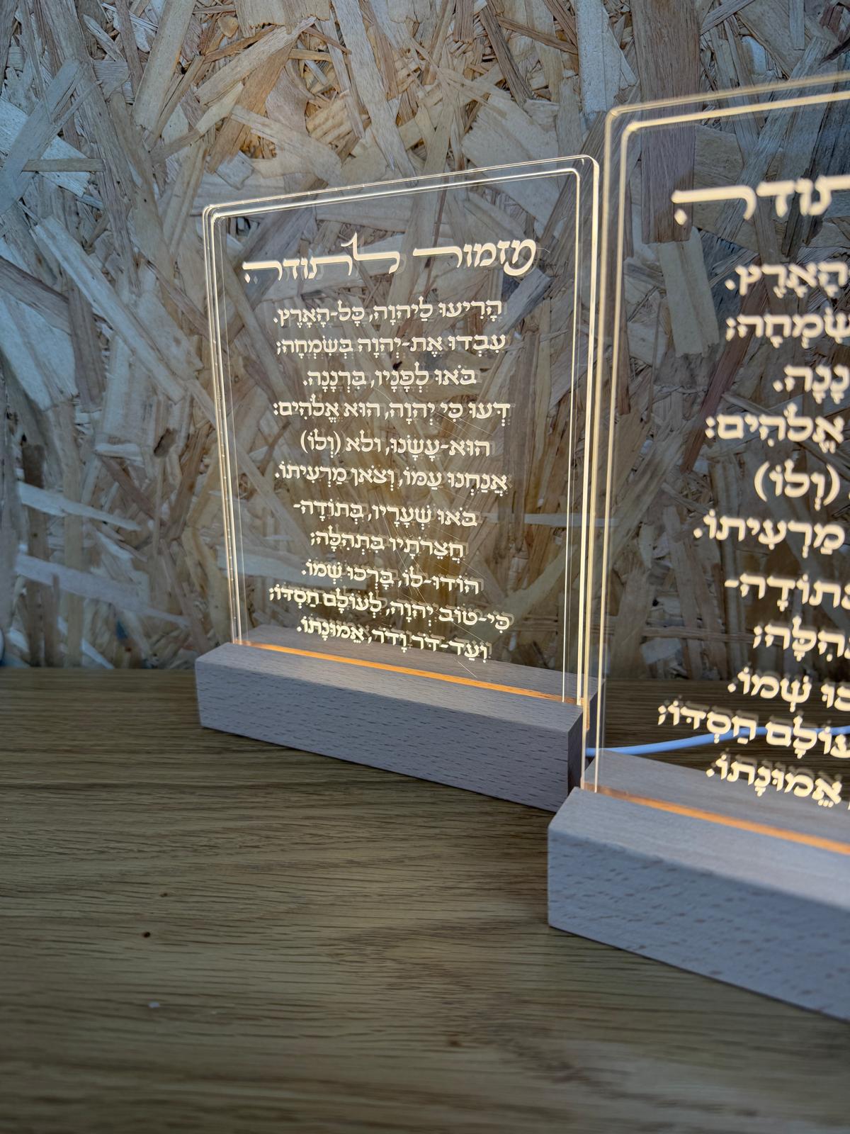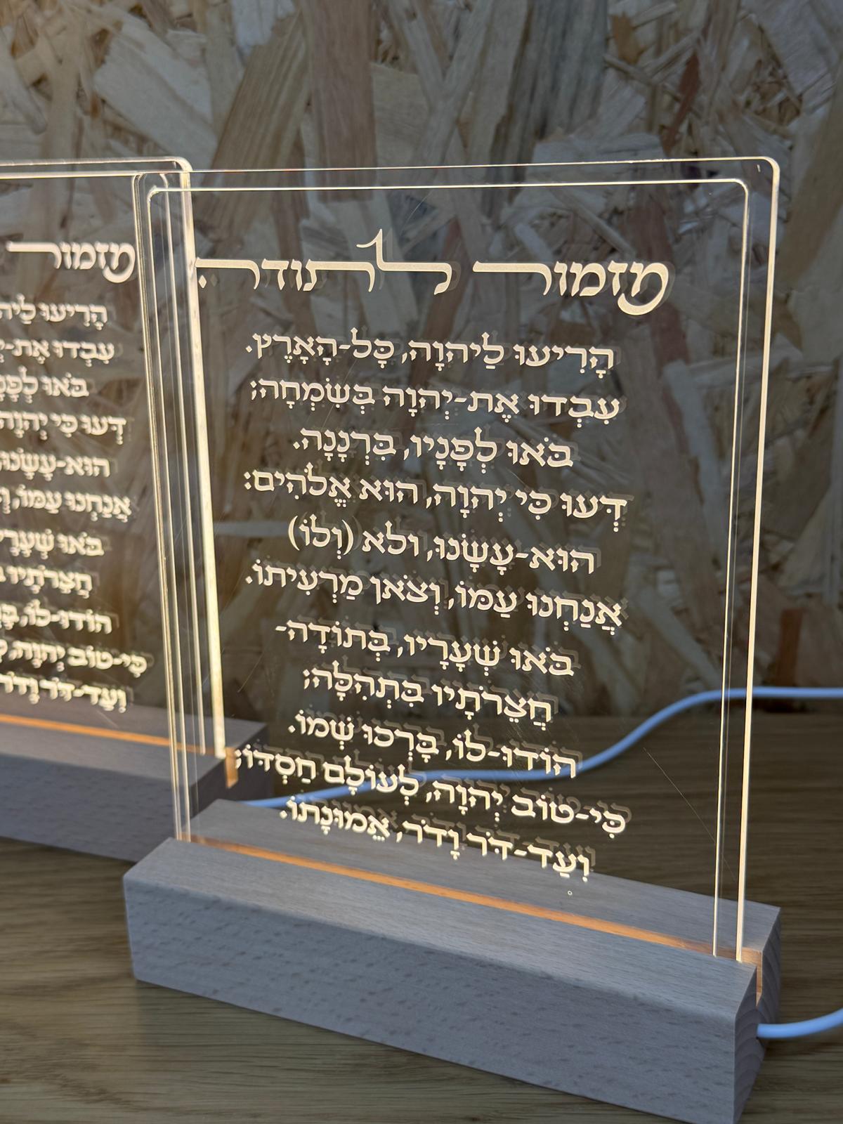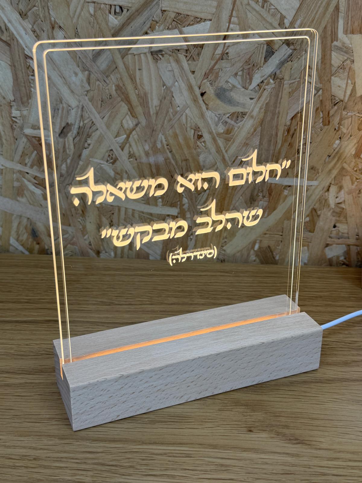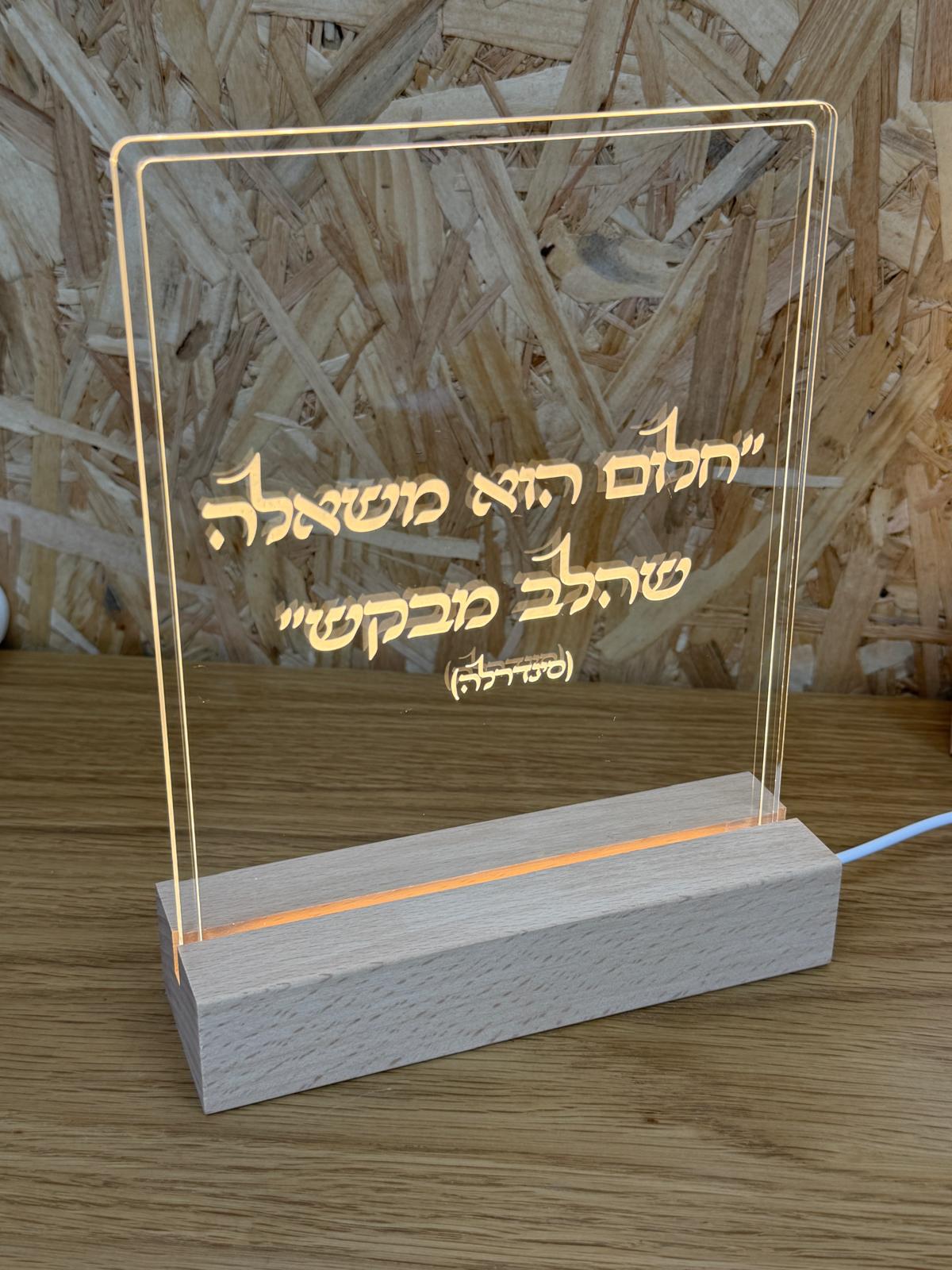 מעמד עץ עם ברכה מוארת מעמד עץ עם פרספקס שקוף אקרילי ניתן כל צורה ומלל בהתאמה אישית ניתן להוסיף חריטה על בסיס העץ בתוספת תשלום מחובר עם כבל USB