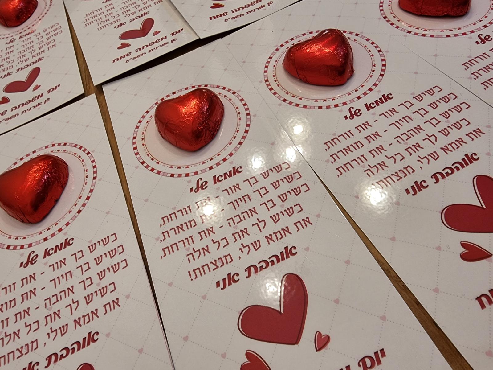 גלויה מעוצבת עם שלישיית שוקולדים כיתוב ועיצוב בהתאמה אישית ניתן להוסיף לוגו חברה. הגלויה מגיעה עטופה בצלופן. *כשרות בד"צ *השוקולד פרווה * מינימום 20 יחידות לרכישה צרו קשר לאחר רכישה לסגירת עיצוב וכו'